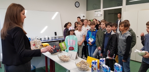 Dies war erneut Anlass für die Fitness Coach der Maximilian Lutz Realschule die Aktion „Müsli to go“ für die Klassenstufe 5 durchzuführen. Unterstützt wurde die Aktion von Frau Wieck (Ernährungsberaterin; EDEKA in Besigheim), die morgens reichlich Müslipackungen an die Schule brachte.