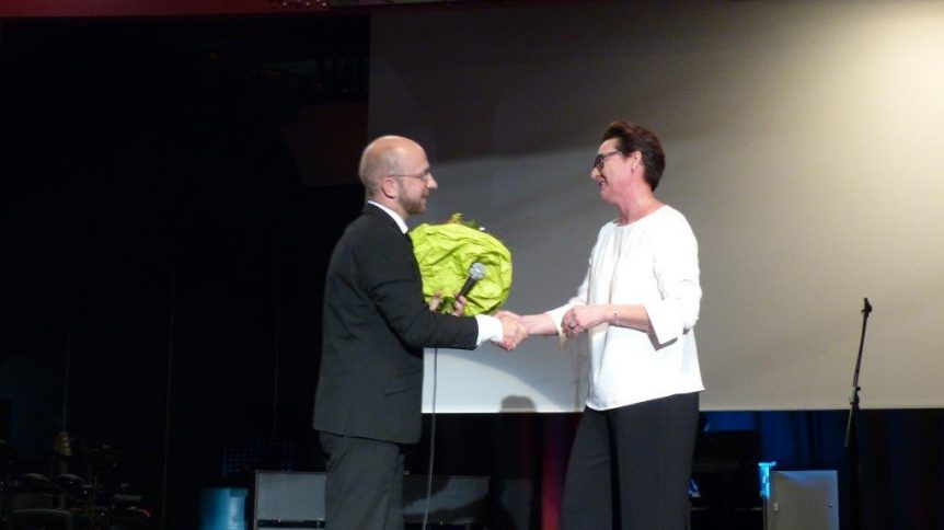 Die erste längere Rede kam von unserer Elternbeiratsvorsitzenden Brenda Lebherz. Sehr eindrucksvoll und charmant bot sie mit Bildunterstützung eine regelrechte Zeitreise dar von den Anfängen an der MLRS in Klasse 5 bis hin zum Abschluss 2019. Zum Bedauern aller Beteiligten war das Frau Lebherz letzter Auftritt bei einer Abschlussfeier der MLRS in dieser Position, da sie nun den Rücktritt antritt, weil ihre Tochter nun die Mittlere Reife hat. Mit lauten Applaus und einem großen Blumenstrauß von unserem Schulleiter Christoph Hofer wurde sie verabschiedet.