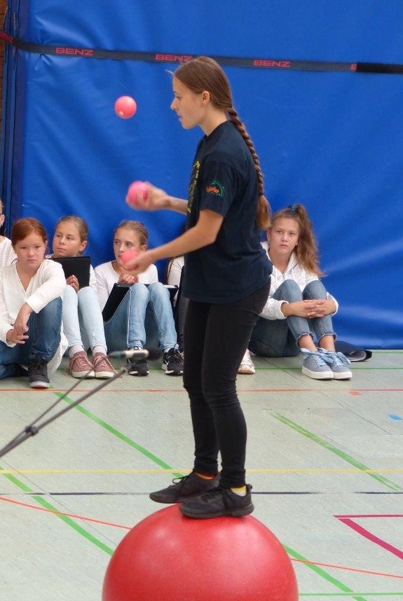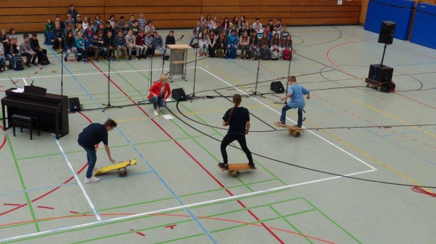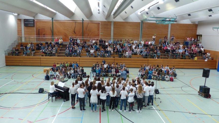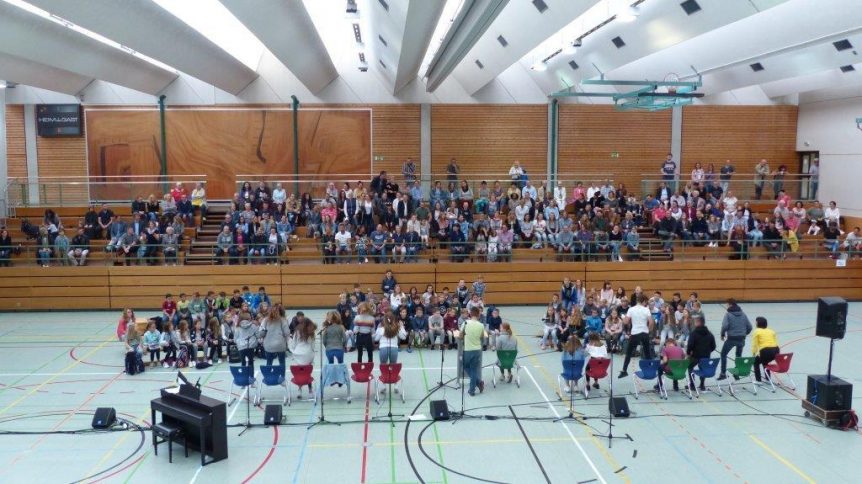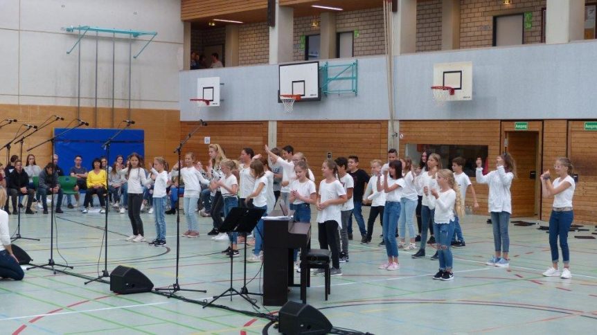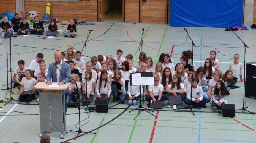 70 Schüler des Musikprofils eröffneten die Veranstaltung mit schwungvollen Liedern und nach der Begrüßung durch den Schulleiter Herrn Hofer zeigte die Rope-Skipping und Akrobatik-AG ihr Können. Außerdem stellten sich die Sozialarbeiterin Frau Brecht und die Streitschlichter vor. Herr Gutöhrlein als Konrektor, der Vorsitzende des Förderkreises, Herr Lehmann und die aus dem Amt scheidende Elternsprecherin Frau Lebherz begrüßten die 83 neuen SchülerInnen herzlich. Mit großer Spannung verfolgten dann alle die Verteilung der Kinder in die drei Klassen, die von Frau Huth, Frau Simmler und Frau Penka geleitet werden. Eine tänzerische Darbietung des Musikprofils und eine bewegte Vorstellung der Fitness Coaches beendeten die gelungene Einschulungsveranstaltung.