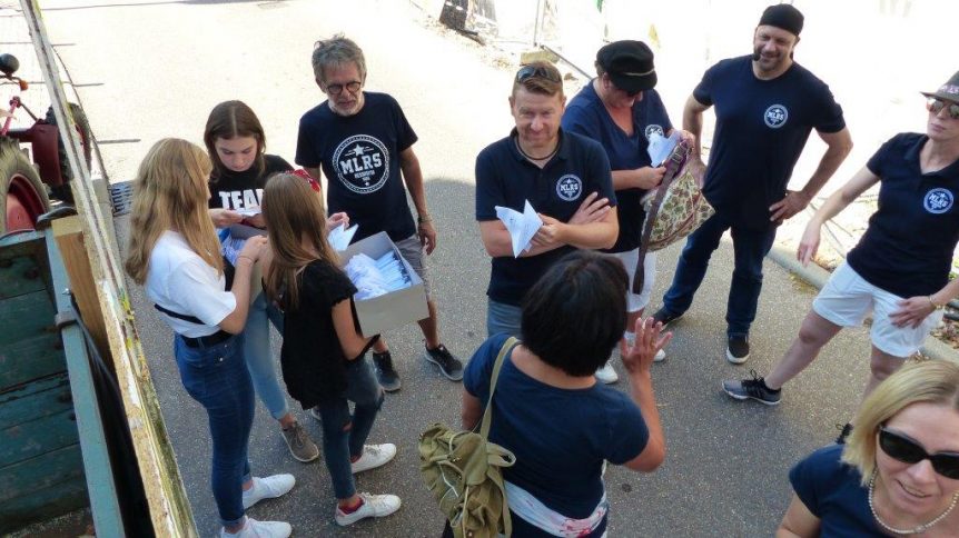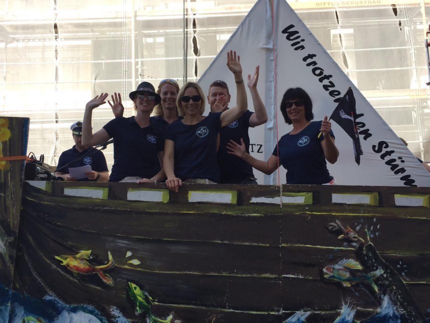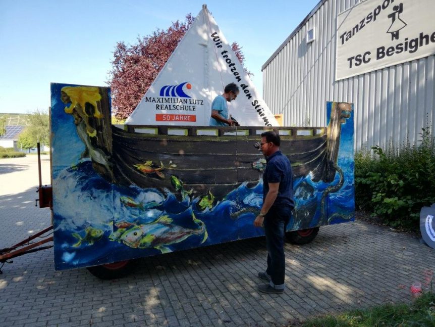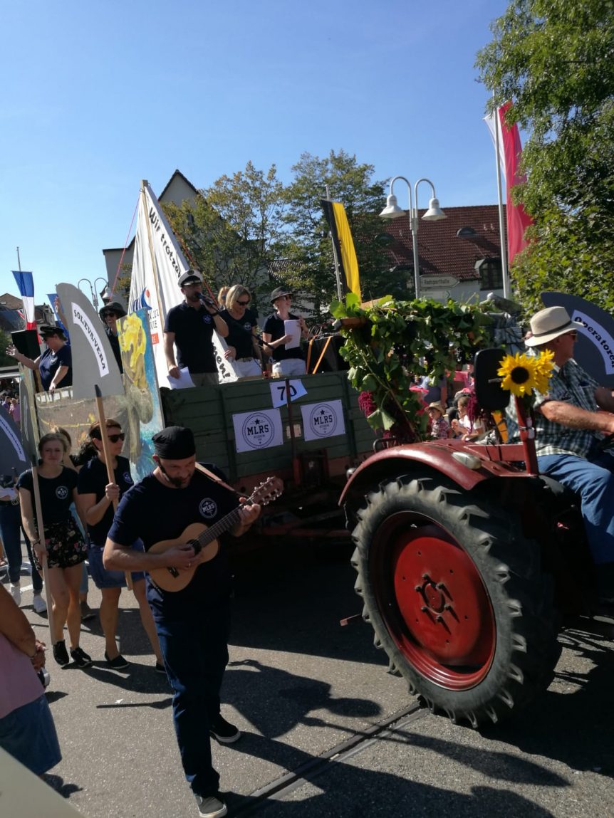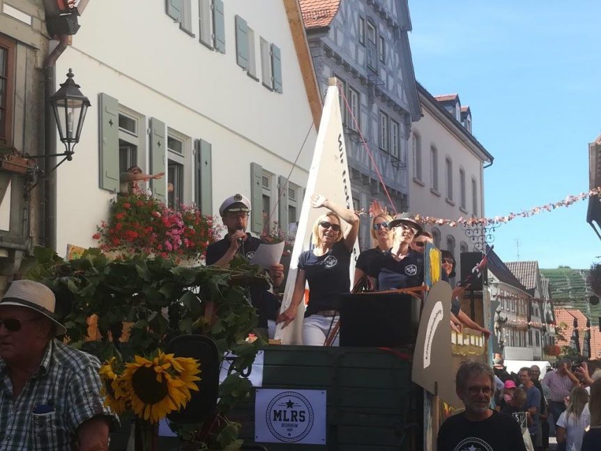 Anker los und alle Segel setzen. „Wir trotzen den Stürmen“, das war das Motto des Motivwagens, den die MLRS zum 50 jährigen Jubiläum für den Winzerfestumzug gestaltete. Mit Feuereifer bastelten und malten die Lehrkräfte am Segelschiff, welches sich dann aber auch wahrlich sehen lassen konnte. Mit maximaler Masthöhe – vielen Dank an das Bauamt Besigheim für die nötigen Infos – konnten wir dann beim Umzug mitfahren. Umzingelt wurde das Schiff von weißen Haien, welche diejenigen Dinge auf ihren Flossen zur Schau trugen, die allen am Schulleben Beteiligten dasselbe immer wieder schwer machen. Zusätzlich verteilten Schülerinnen und Schüler kleine Leckereien an die Kinder und selbstgefaltete Schiffe mit aufgedruckten Ratschlägen zum Thema Bildung. Highlight war zweifelsohne die Soundanlage des Wagens. So konnten wir das Publikum mit Livemusik und -gesang unterhalten und kräftig für gute Stimmung sorgen. Es war sehr schön mitzuerleben, wie die Stimmung übersprang und alle, egal ob groß oder klein, alt oder jung, lauthals mitsangen. Für alle Beteiligten war das ein beeindruckendes Erlebnis und hat Hunger auf mehr gemacht. Wir danken für die tollen Momente und die positiven Rückmeldungen. Sie sind der Lohn für die Anstrengungen und zusätzlichen Arbeitsstunden. Ein spezieller Dank geht an die Kinder und Jugendlichen, die mitgelaufen sind, an unseren Traktorfahrer und an die Lehrkräfte, die den freien Sonntag für unseren Segeltörn geopfert haben. Zum Abschluss das Zitat des Moderators des Festumzugs: „Wahnsinn, so dynamische, junge und junggebliebene Lehrerinnen und Lehrer! Die sind super drauf und verbreiten eine Wahnsinns-Stimmung. Eine tolle Schule, die Maximilian-Lutz-Realschule!“