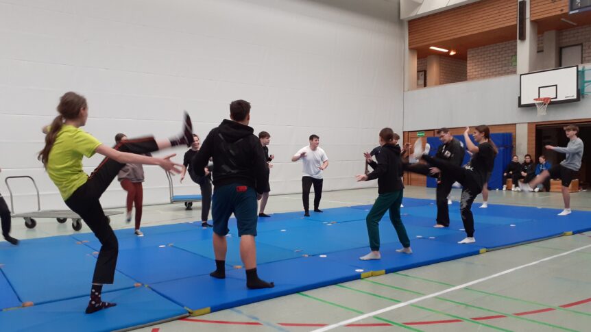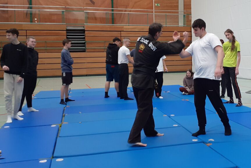 Peter Busch (Sa Buhm Nim, 4. Dan) zeigte den Schülerinnen und Schüler verschiedene Techniken, welche von der Klasse begeistert ausprobiert wurden. Die 10b lernte die ersten Schlag- und Tritttechniken sowie verschiedene Abwehr- und Befreiungstechniken kennen.