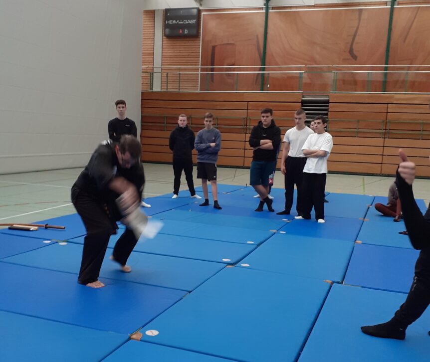 Die Klasse 10b bekam einen actionreichen Einblick in die moderne Kampfkunst „Kuk Sool Won“, welche die verschiedensten Kampfkünste Koreas in sich vereint. Kuk Sool Won beinhaltet Angriffs- und Verteidigungstechniken (Schläge, Tritte, Hebel und Würfe), Waffentechniken ( wie Langstock, Schwert, Nunchakus oder Fächer) aber auch Mentaltraining, um den Körper physisch und mental zu stärken.