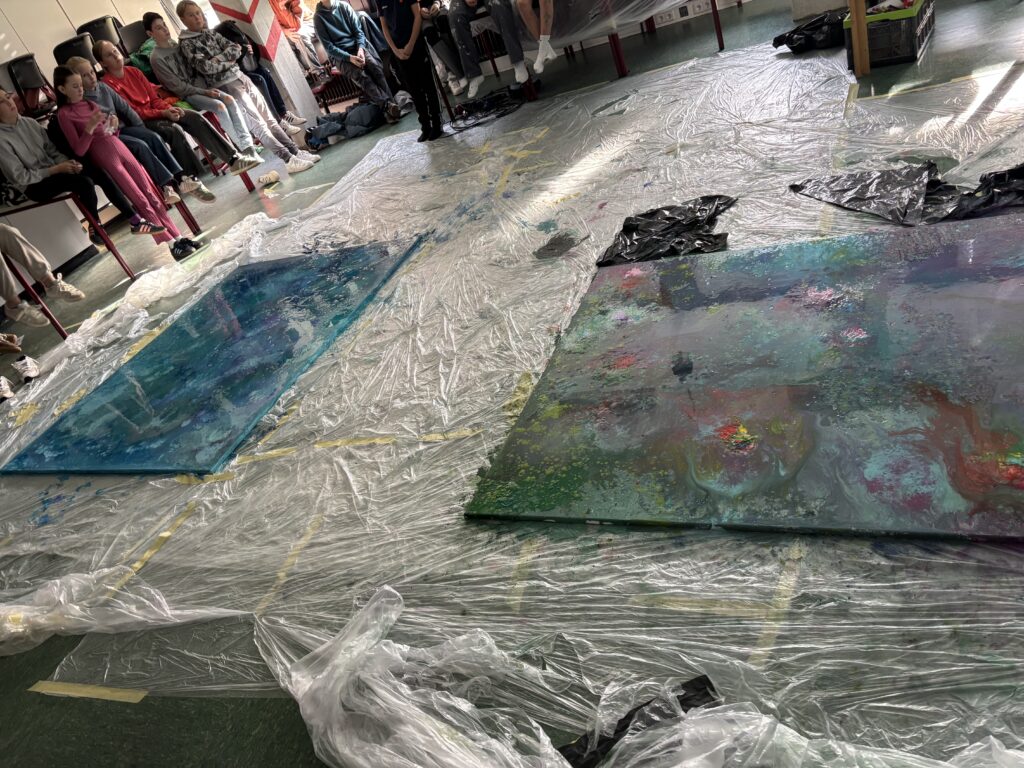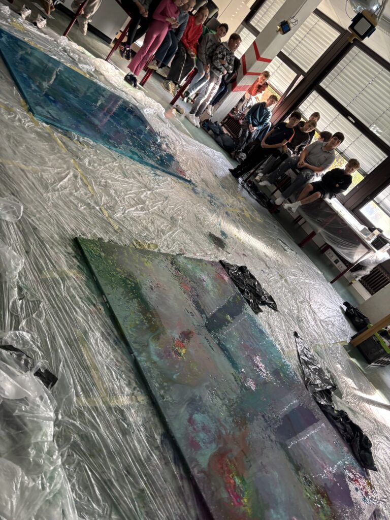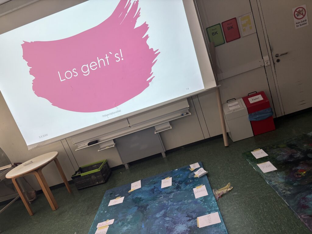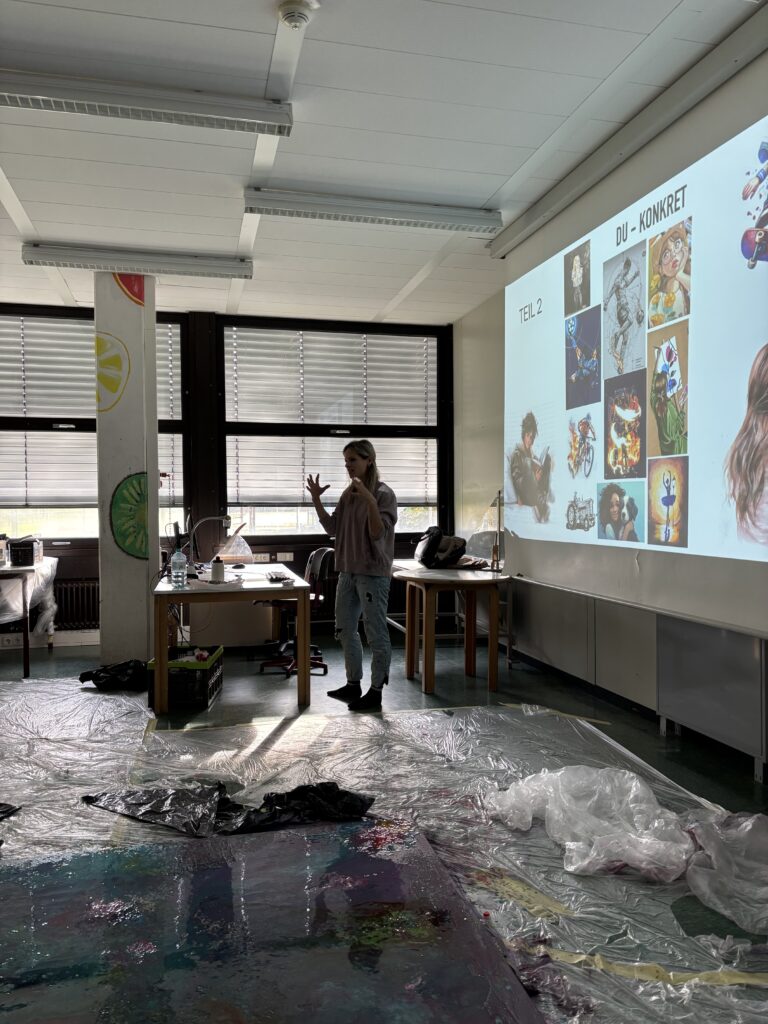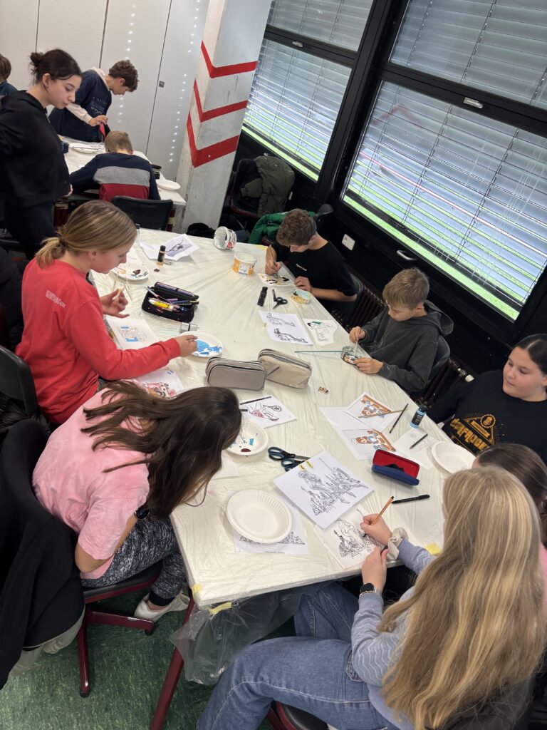Die Klasse 7b der Maximilian-Lutz-Realschule führte in der ersten Profilwoche des Schuljahres ein besonderes Kunstprojekt durch. Aufgrund der Idee und Initiative von Judit Groß, der Mutter eines Schülers, gestalteten die Kinder auf zwei große, grundierte Leinwände einen abstrakten Hintergrund und trugen anschließend mit Acrylstiften, Acrylfarben und kleine Pinsel individuelle Bilder auf. Zuvor gab Groß eine kurze Einführung in verschiedene Maltechniken, Werkzeuge und der Komposition von Bildern. Als Ergebnis entstand ein großes, gemeinsames Werk der ganzen Klasse, in welchem die Einzelbilder aller Schüler eingebettet waren. Die Kinder visualisierten so ihre persönlichen Stärken und Zukunftswünsche und wurden dadurch mit Sicherheit für ihren weiteren Lebensweg ermutigt. Unterstützt wurde Groß von Jessica Höß, einem weiteren Elternteil, und der Klassenlehrerin Lisa Huth. Ein besonderer Dank gilt unserem Bildungspartner der VR-Bank, vertreten durch den Bereichsleiter Nico Gräser, die das Projekt voll umfänglich finanzierte und so den Kauf aller notwendigen Materialien ermöglichte.