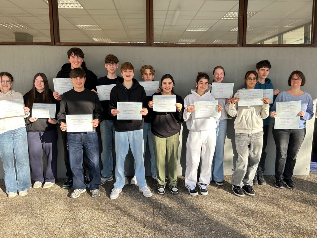 Im vergangenen Schuljahr haben 16 Schülerinnen und Schüler der Klasse 9b an der schriftlichen DELF-Prüfung im Rahmen des Französisch-Unterrichts teilgenommen. 14 von ihnen haben sich dann entschieden, noch an der freiwilligen mündlichen Prüfung teilzunehmen, um das französische DELF-Sprachenzertifikat für das Sprachniveau A2 zu erwerben. Alle 14 haben die Prüfung erfolgreich bestanden und nun auch das offizielle Zertifikat aus Frankreich erhalten. Wir gratulieren allen herzlich zu dieser tollen Leistung!
