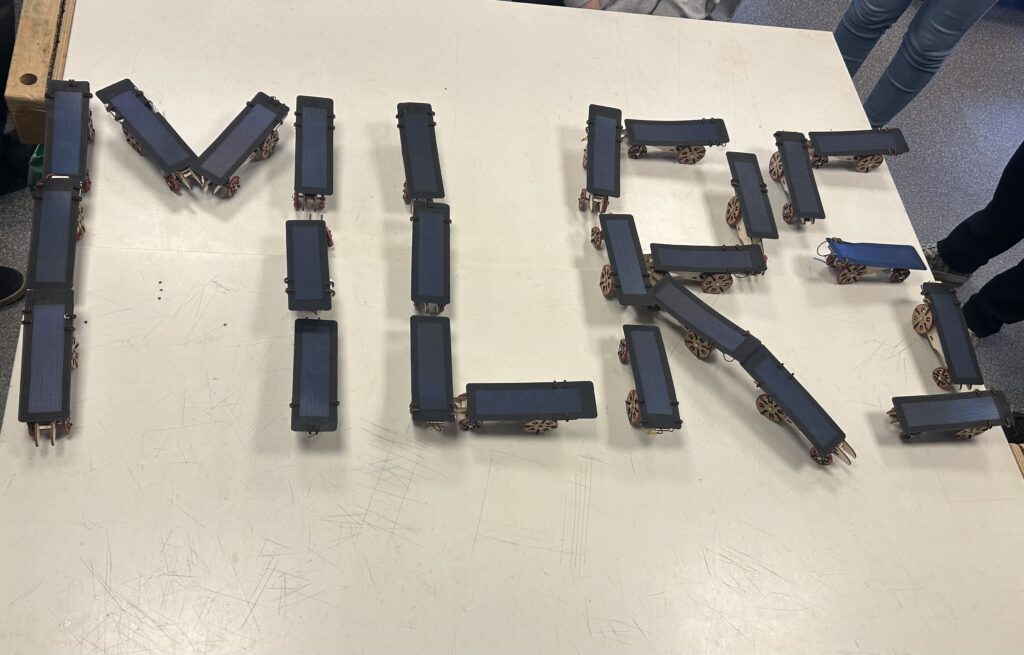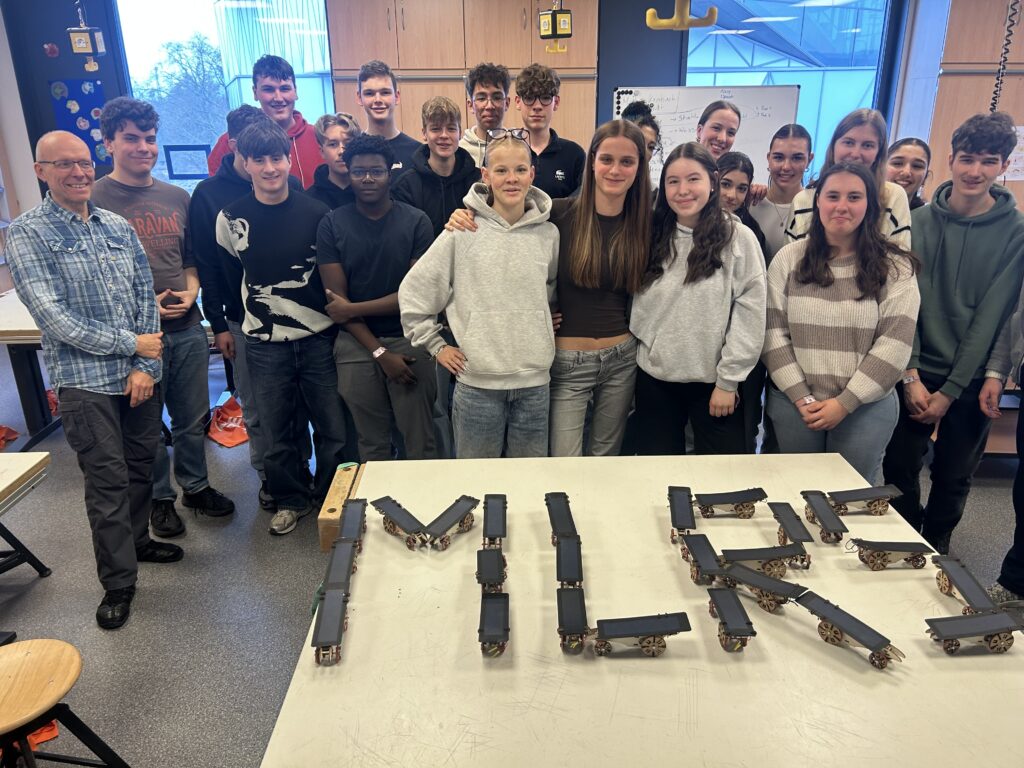So durfte dieses Jahr die Klasse 10b in den Bereich „Solartechnik“ reinschnuppern. Dabei erhielten die Schülerinnen und Schüler nicht nur Einblick in die verschiedenen Vorkommen und Nutzungsmöglichkeiten von Energie, sondern durften auch selbst tätig werden. Gemeinsam mit der Unterstützung von Fachleuten der Experimenta Heilbronn wurde im Rahmen eines Workshops ein kleines Solarmobil gebaut. Jede Schülerin und jeder Schüler durfte hierbei ein eigenes bauen. Egal, ob man schneller war oder langsamer, am Ende haben es alle geschafft und testeten stolz ihr Solarmobil auf der kleinen Rennstrecke im Raum.